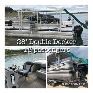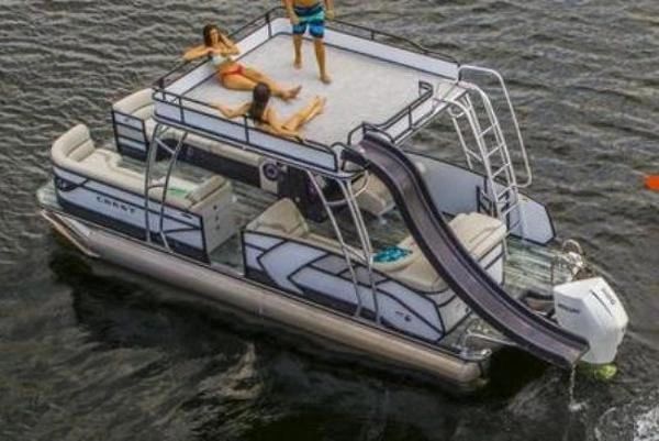Our Double decker party barge has a large upper sun deck with water slide and room for 16 Passengers